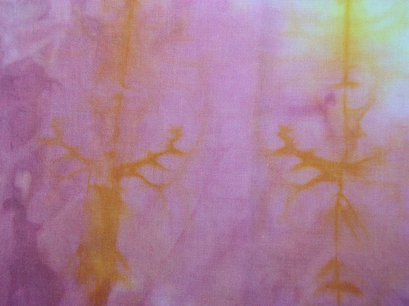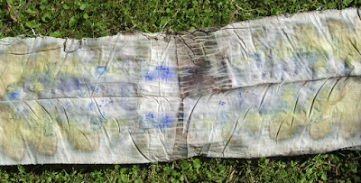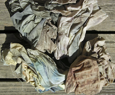 Koska en ollut varma, miten hyvin väri tarttuu kankaisiin (eikä lopputuloksen tarvinnut olla tasainen), jätin sienet kankaiden sekaan väriliemeen. Puretusaineena käytin alunaa ja soodaa - alumiinikattilassa.