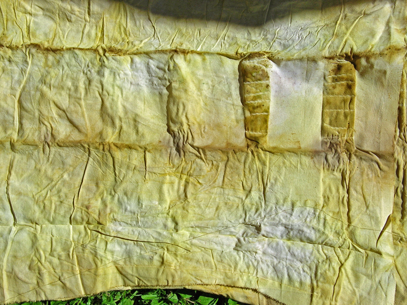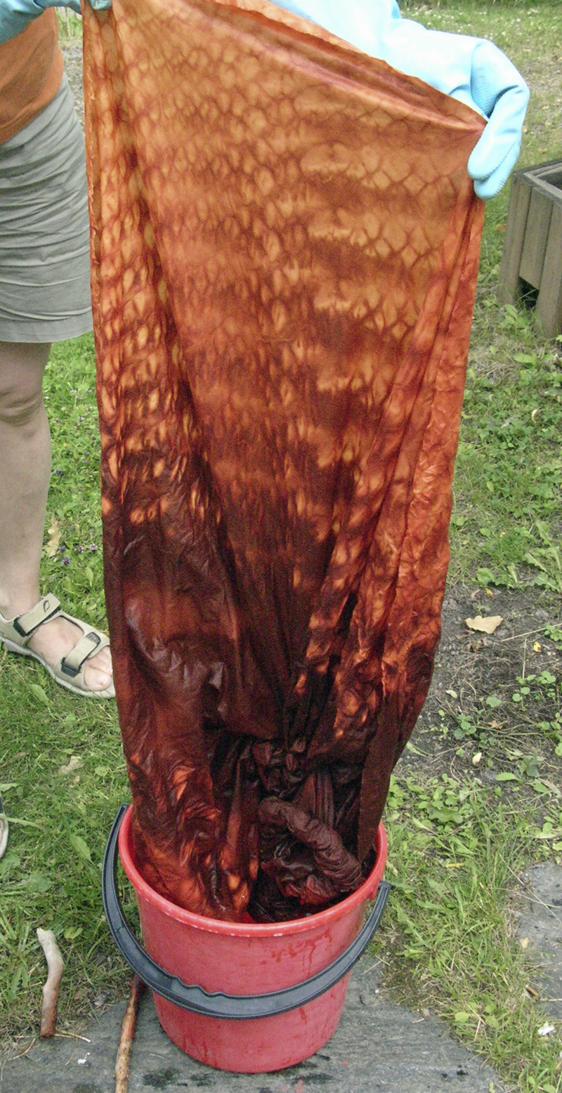 Lopuksi siivilöin väriliemestä suurimman osan sienistä ja paketoin ne pariin kangasnyyttiin seuraavaa värjäystä varten.