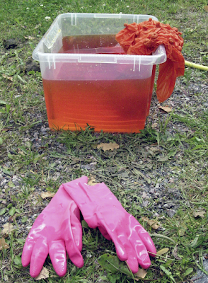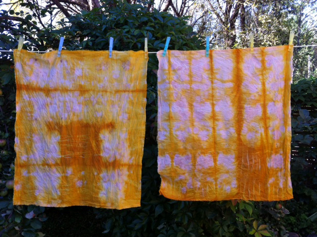 Jätin kankaat yön yli seisomaan ja jäähtymään väriliemeen. Seuraavana