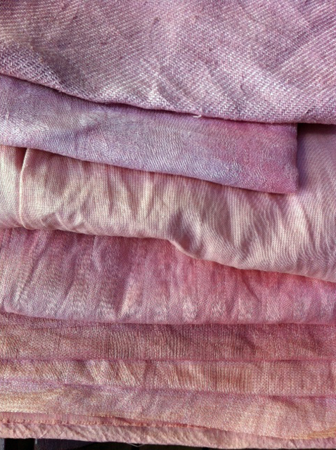 Ja kun kerran alkuun päästiin, niin seuraavana päivänä jatkoin sipulinkuorilla. En pessyt kattiloista punaista väriä pois, koska mahdollinen oranssin vivahdus ei olisi haitaksi. Jätin jälleen sipulinkuoret kankaiden sekaan.